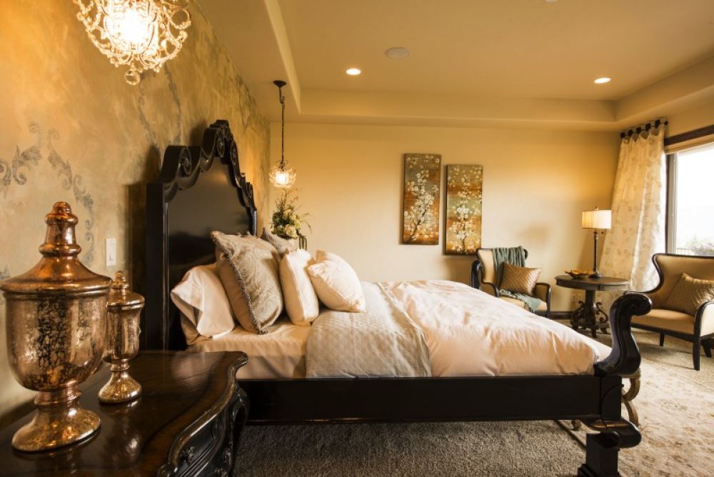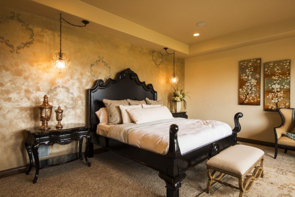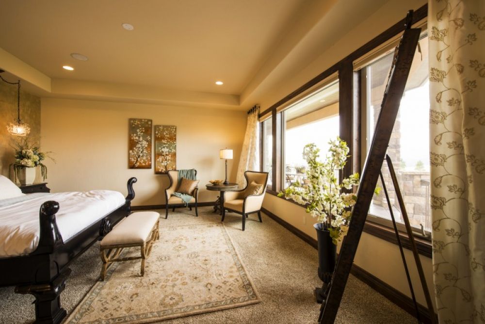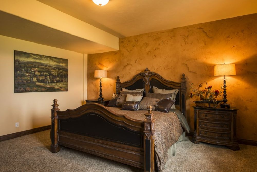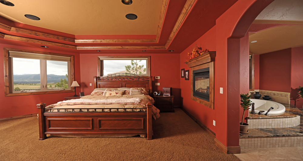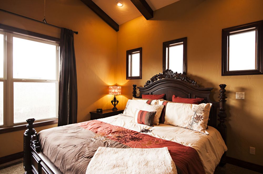 Rich color, warm wood, and large windows add to the Tuscany feel of this bedroom.